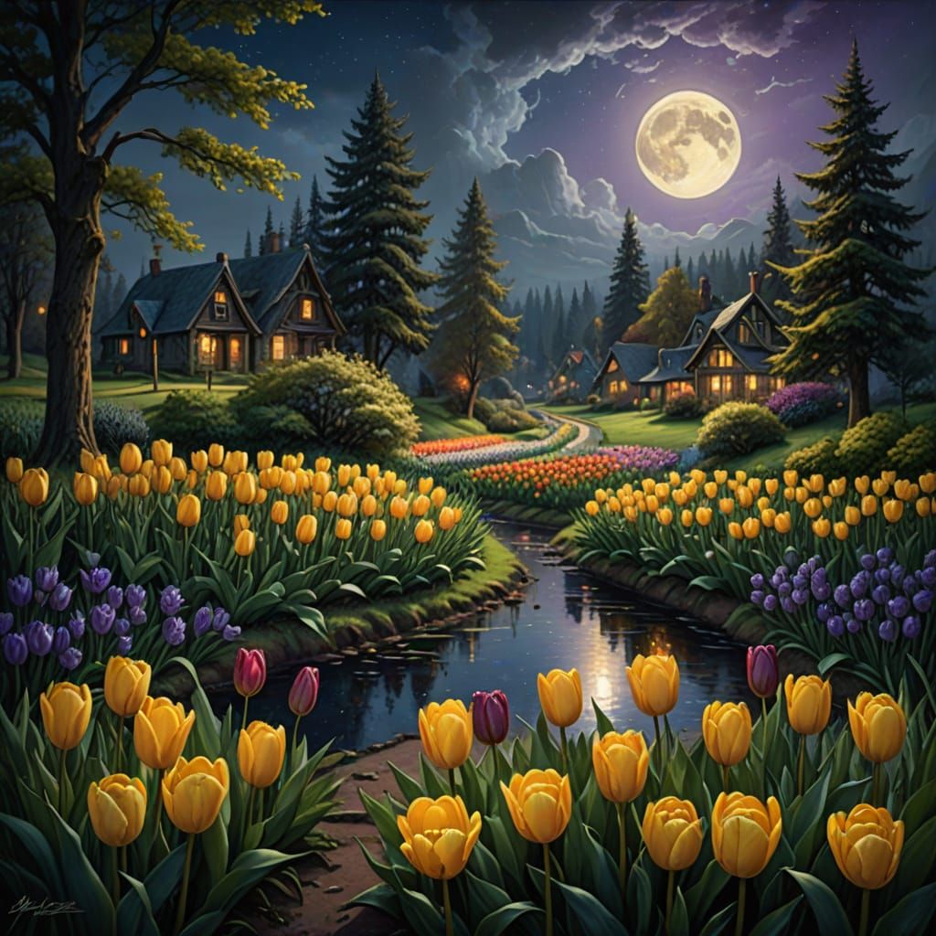 This enchanting oil painting captures the mystique of a moonlit night, with vibrant tulips and a large moon looming in the background, under a dark and starry sky. Soft brushstrokes and thick paint create a textured, layered effect, with warm golden lighting and deep shadows.