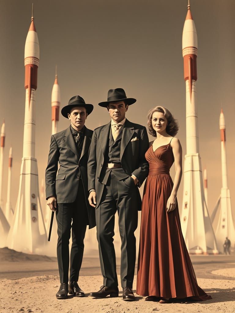 This image shows three actors in vintage science fiction costumes against a retro-futuristic backdrop. The artwork has a distressed aesthetic reminiscent of silent films, with visual elements that evoke a blend of Syd Mead and H.R. Giger.