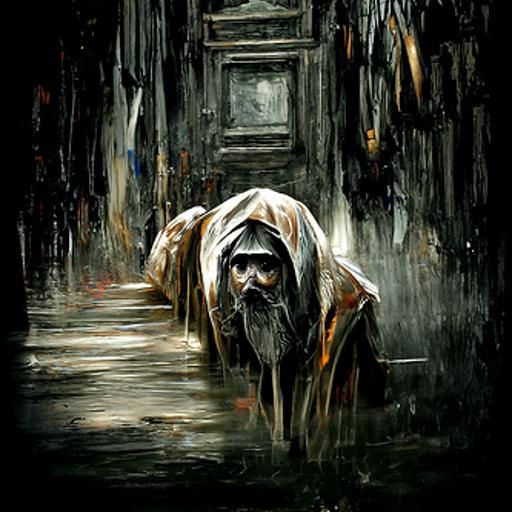 A sinister, photorealistic image of a figure walking a path. The artwork evokes a sense of horror through detailed illustration, reminiscent of classic oil paintings and digital art.