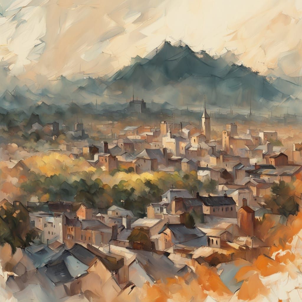 A bustling urban landscape depicted with thick, textured brushstrokes and splashes of complementary colors, creating a vibrant, energetic atmosphere with a soft glow, in an expressive oil painting style.