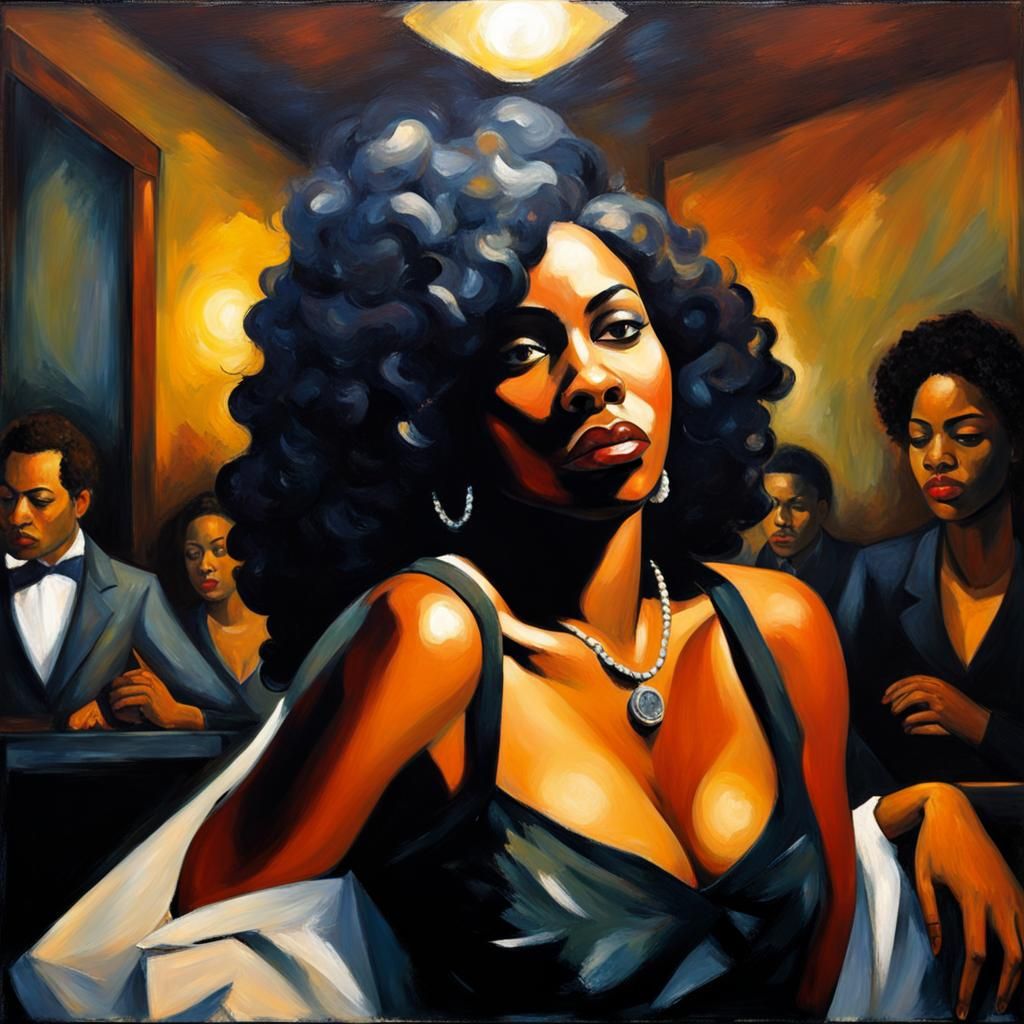 This is a painting of a woman in a nightclub waiting on her date to arrive.
