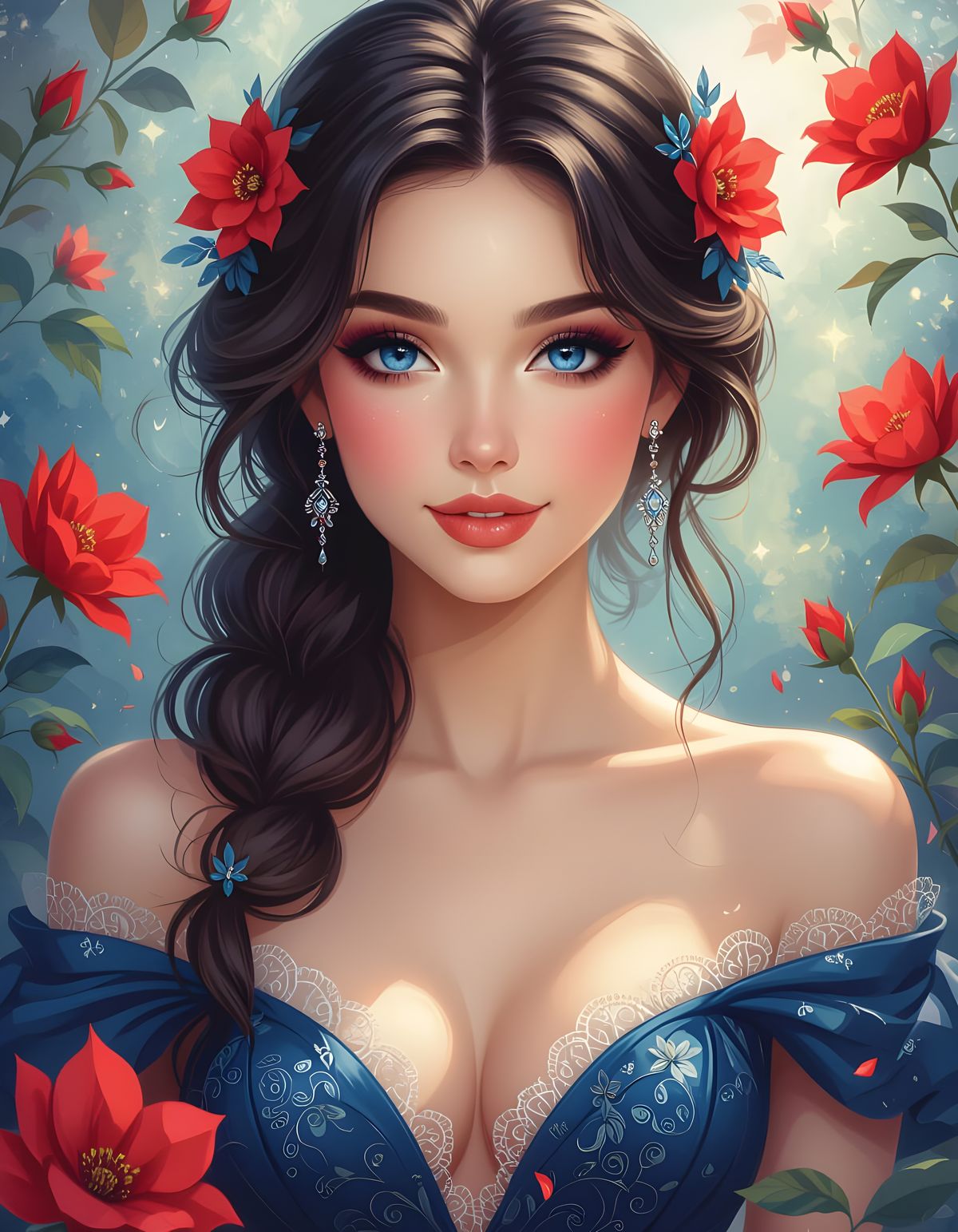 This image shows a beautiful woman with large indigo eyes and a charming smile, adorned in an elegant dress and surrounded by scarlet flowers. The artwork has a surreal, dreamy quality with bright spring colors and watercolor effects.