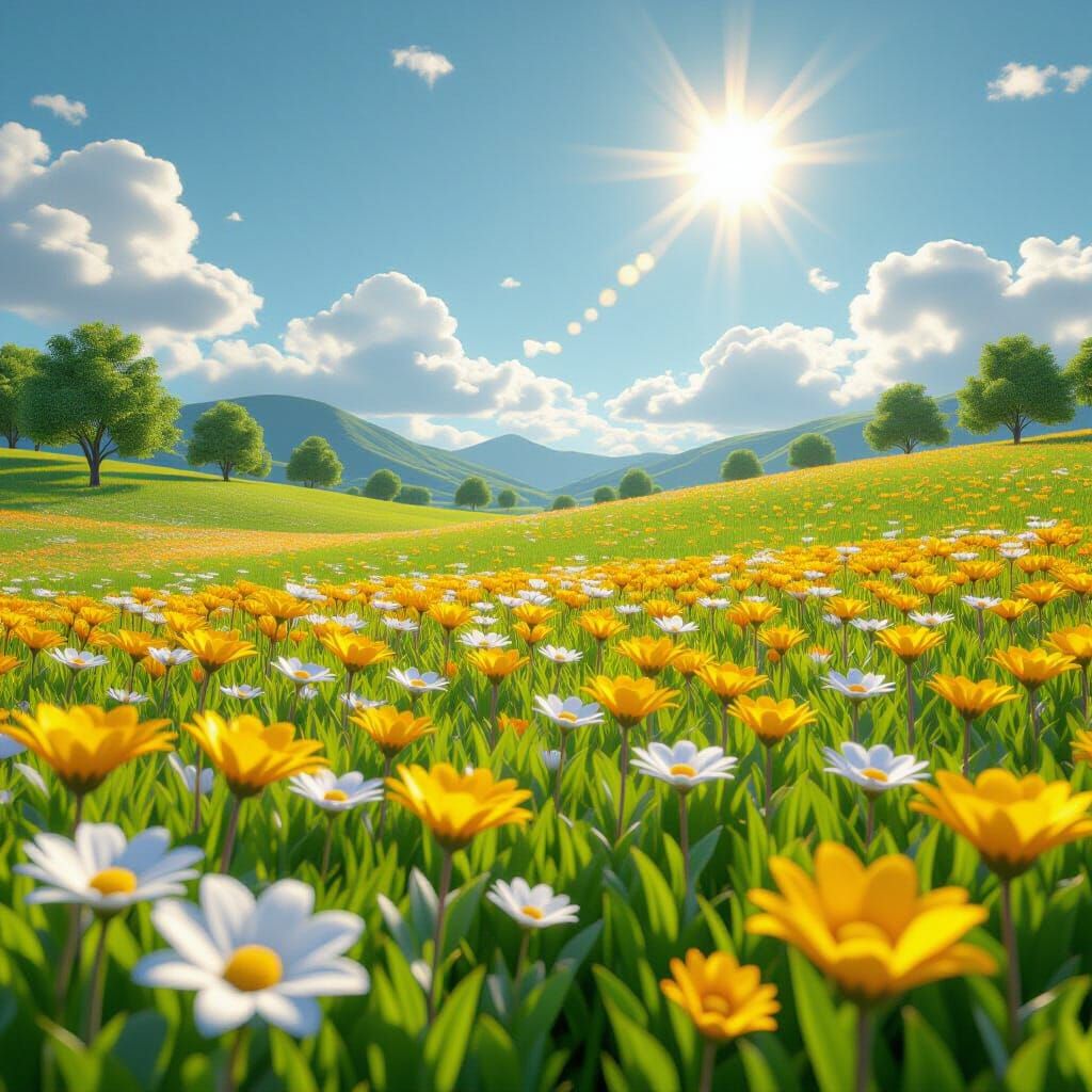 This image depicts a cheerful 3D anime landscape featuring blooming Alto flowers, a bright yellow sun, and a clear blue sky. Rendered with extreme detail and clarity, it evokes a happy atmosphere.