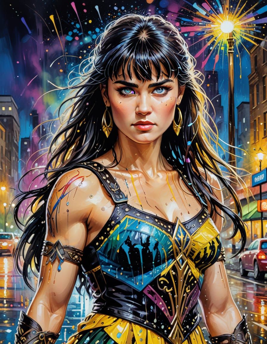 A close-up image of Xena Warrior Princess in a rainbow dress against a night city backdrop. The artwork is vividly colorful, resembling an award-winning oil on canvas painting with a cute and attractive aesthetic.