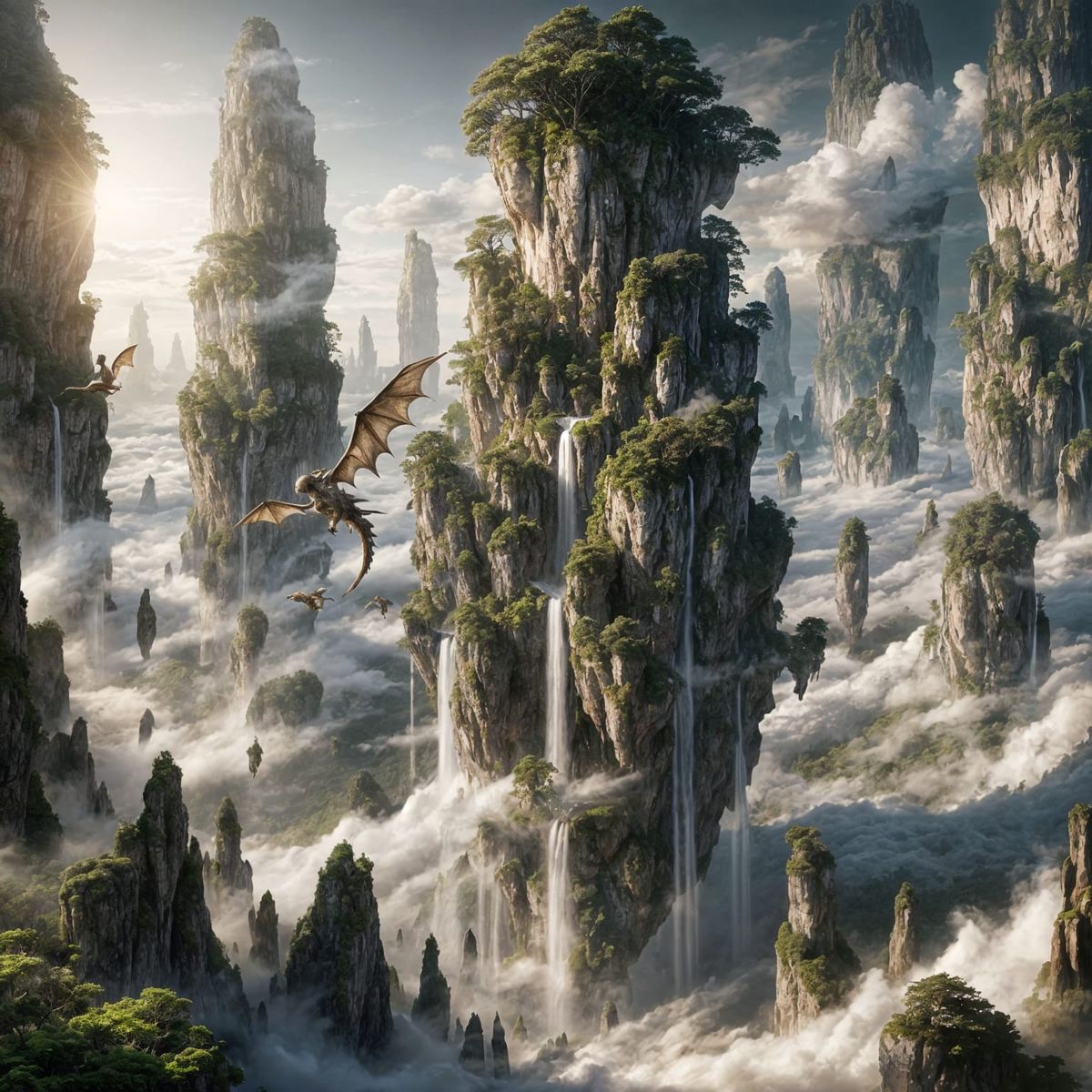 This image depicts vast, ancient forests and cliffs on massive islands floating high above the clouds, with waterfalls cascading into mist. Majestic wyverns soar between these airborne landmasses in epic fantasy style.