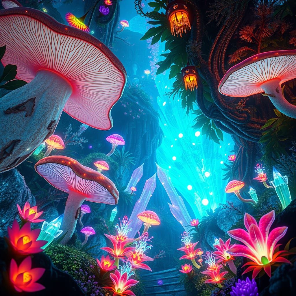 This image showcases a vibrant, glowing forest teeming with exotic flora, including giant iridescent mushrooms and radiant crystalline plants. The scene features intricate, hyper-realistic environments with meticulously crafted textures and dynamic lighting, evoking a sense of wonder and otherworldliness...