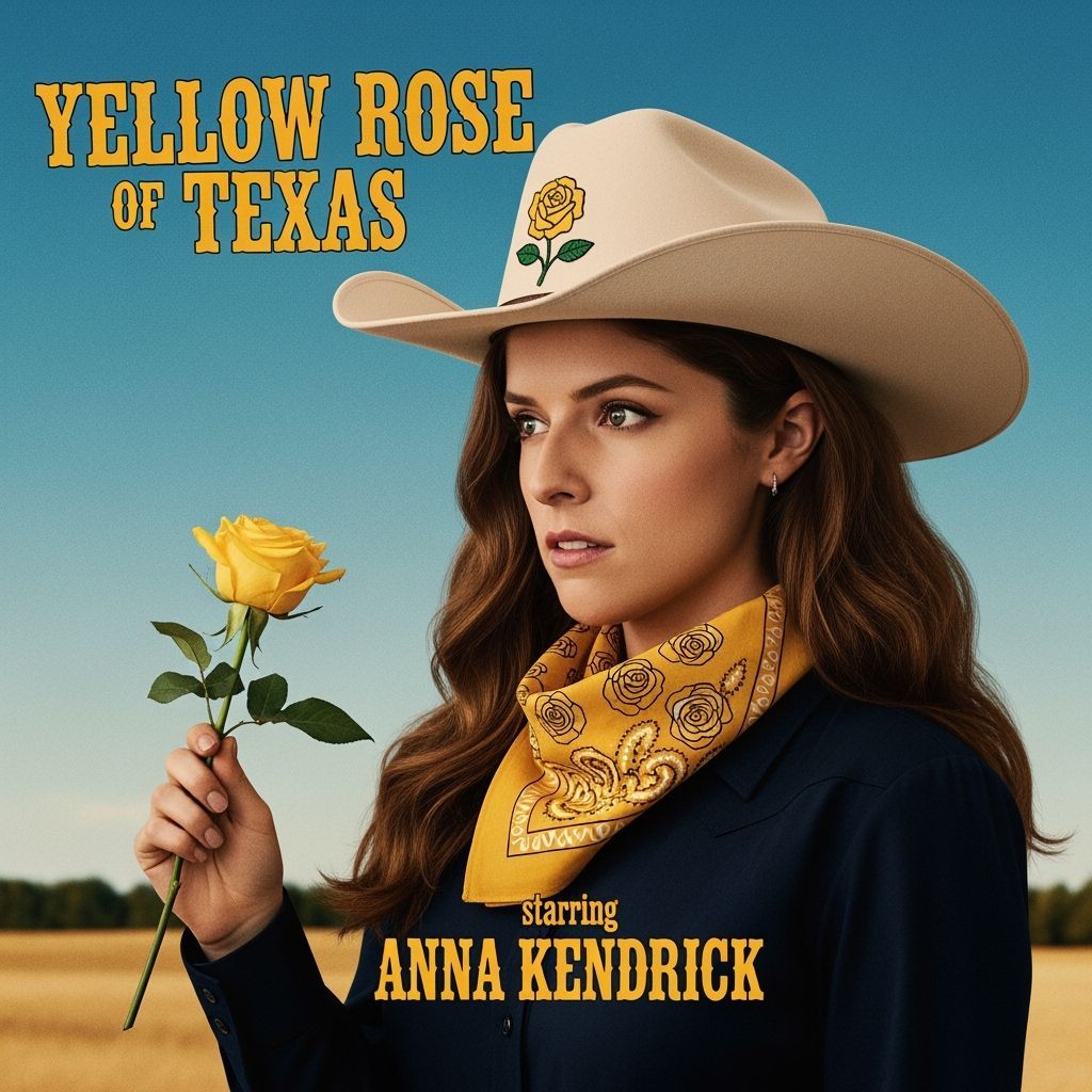 This image shows Anna Kendrick as a cowgirl holding a yellow rose, designed as a movie poster. Features cinematic lighting and film grain for a dramatic, live-action feel.
