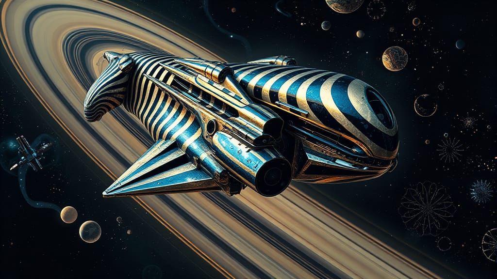 This image depicts a futuristic starship with shimmering gold and iridescent blue stripes, evoking a sense of otherworldly mysticism and celestial wonder, as if infused with the artistic sensibilities of biomechanical art and futuristic design.