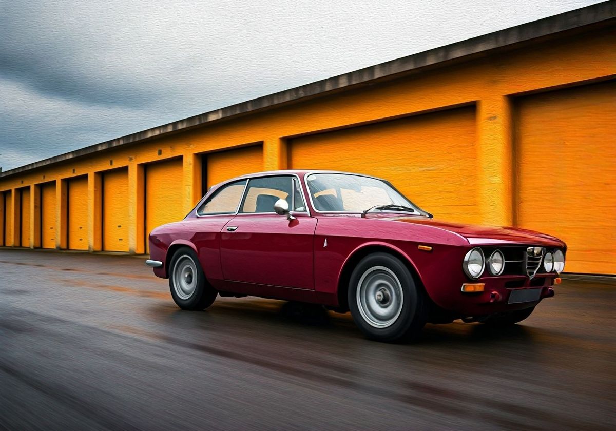 This image shows a vintage Alfa Romeo sports car speeding past the old Targa Florio pit lane in Sicily. It's a rainy day, and the colorful, abandoned pit garages create a poignant backdrop. Gouache and watercolor techniques give the image an impressionist style.
