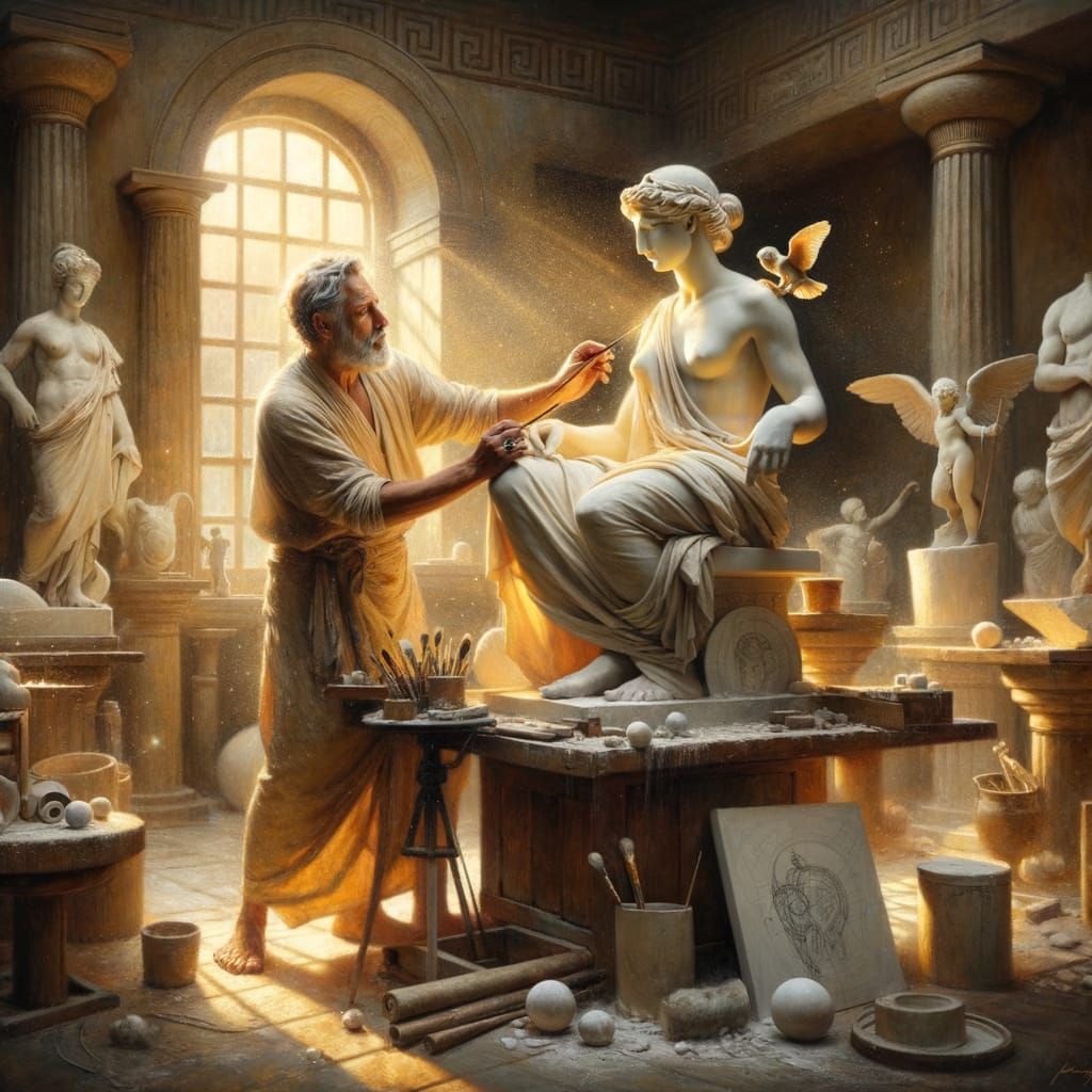 A painting shows a sculptor in his studio working on an Athena statue. Golden light illuminates the scene, highlighting the marble dust and classical tools, in a style reminiscent of classical art.