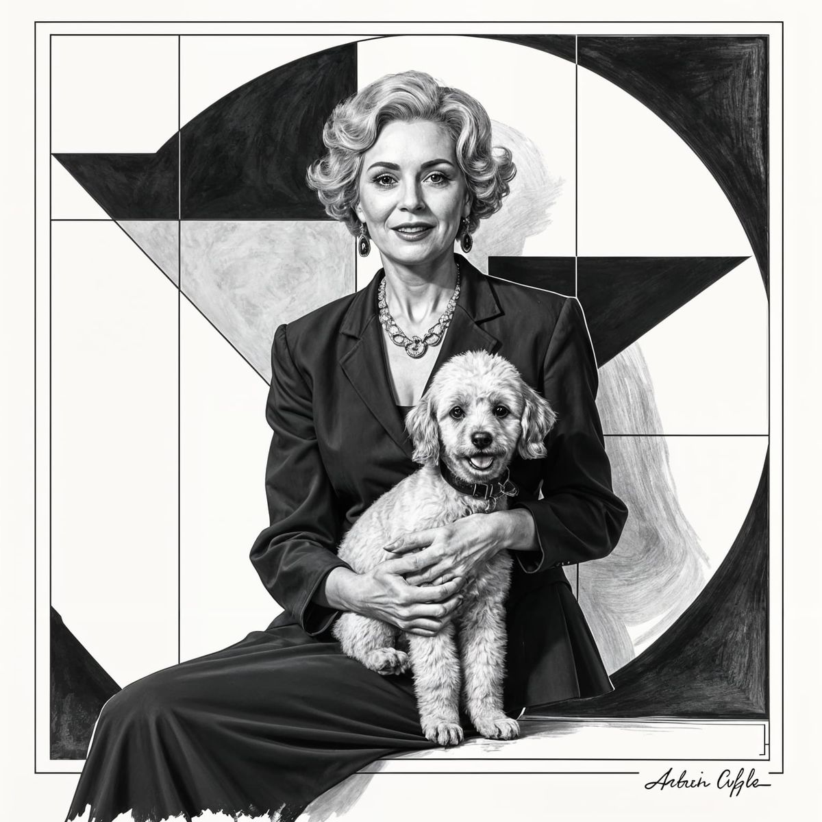 This striking image is a digital art piece in the style of Art Deco, featuring an older woman posing with her pet poodle in a symmetrical composition that adheres to the golden ratio and rule of thirds.
