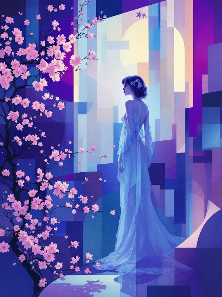 This image blends geometric abstraction with a vintage pin-up style within a retro garden. It features jewel-toned colors, luminous atmosphere, and bold contrasts, evoking a mystical essence.