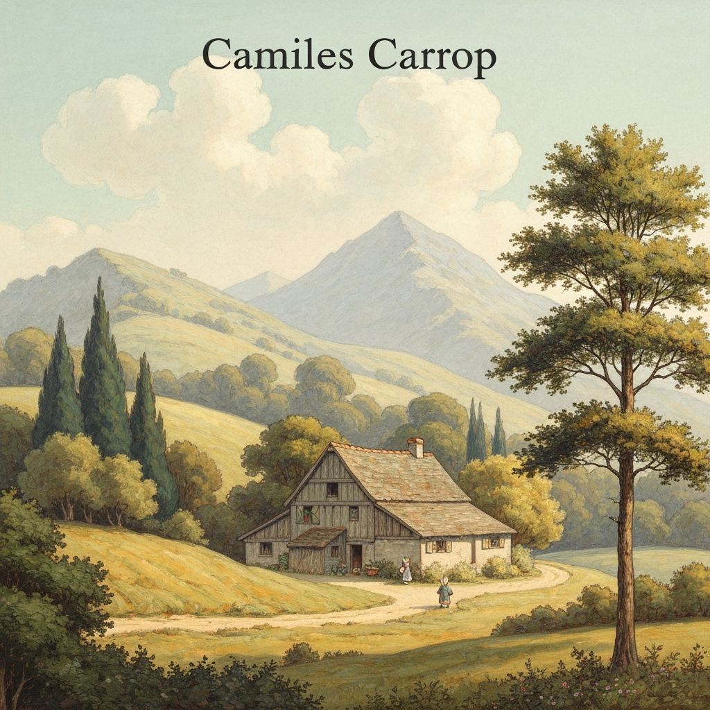 A landscape showing a rustic farmhouse nestled in rolling hills and surrounded by tall trees. This image captures a serene, naturalistic scene with whimsical details, reminiscent of 19th-century pastoral art.