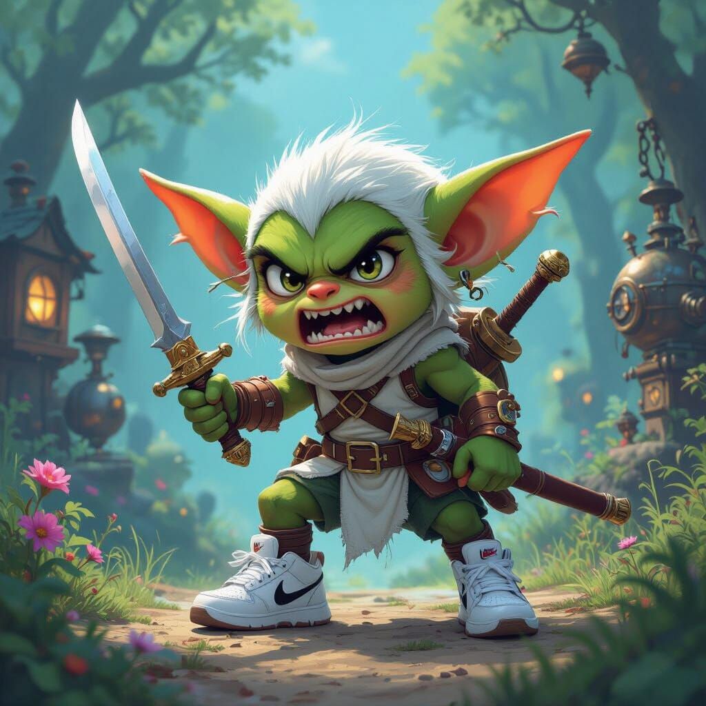 A furious tiny goblin in white sneakers wields a miniature sword amidst whimsical steampunk inventions. The image evokes a vibrant, detailed animation style.