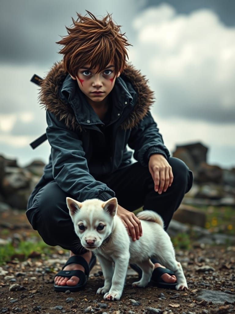 A cinematic image shows a teenage ninja with wild hair and distinctive markings crouching with a white puppy on a rocky training ground beneath a stormy sky. The artwork is reminiscent of a film still.