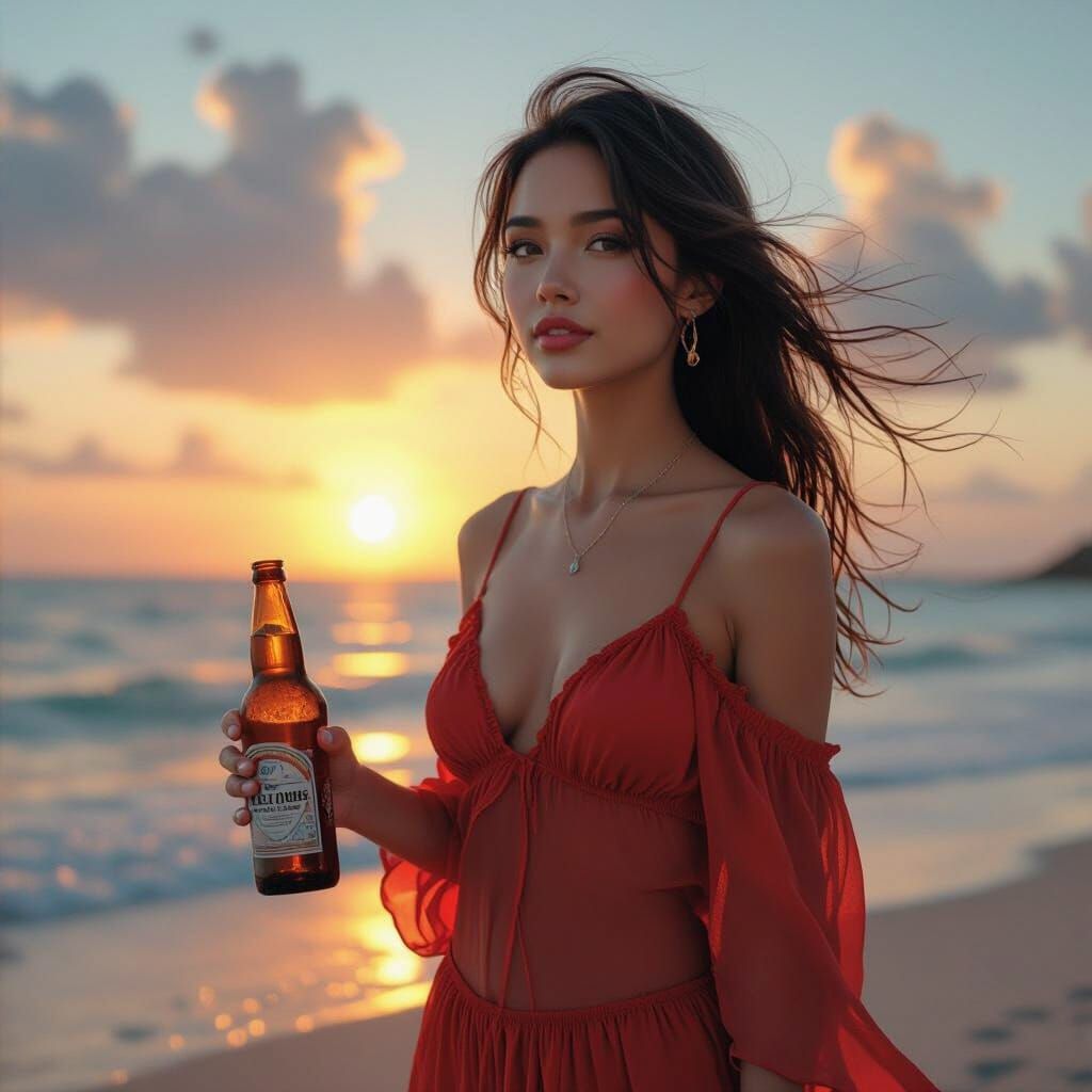 This image shows a woman in a red dress on a beach holding a beer. The setting sun colors the sky in shades of red and orange, in a cinematic and detailed style.