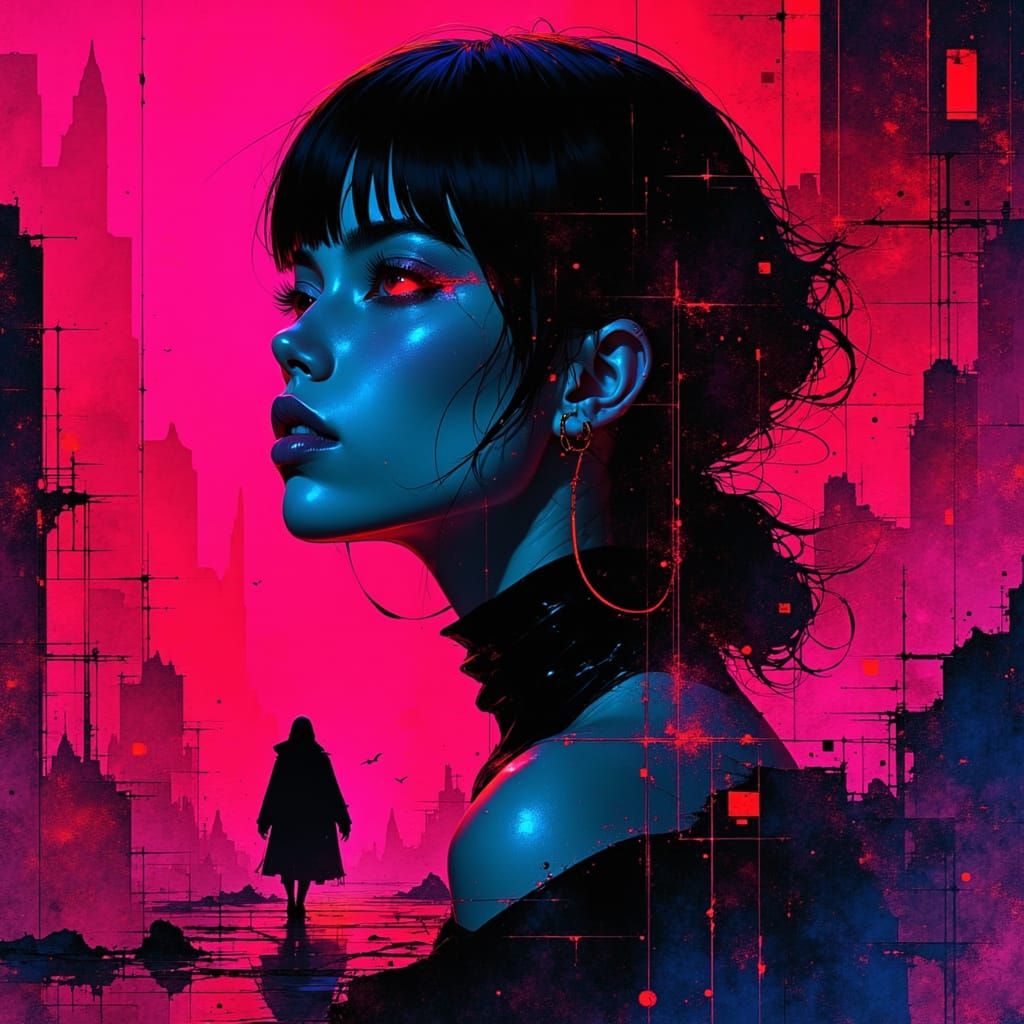 This image shows a beautiful female dancer amidst a surreal, futuristic city at night. Visualized energy in neon haze, with mysterious figures and an underground rave vibe. Rendered as a holographic illustration with ethereal lighting.