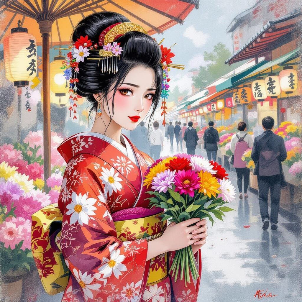This image shows a woman in traditional Japanese clothing selling flowers at a bustling market. The artwork blends Inksplash with expressive strokes, serene elegance, and emotive depth in an impasto style.