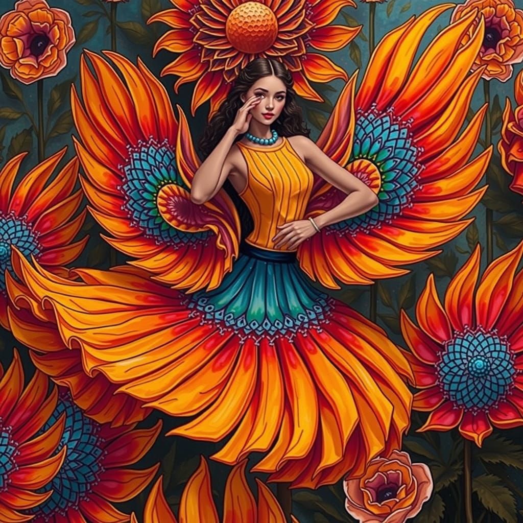 This image shows a yellow dress billowing around a figure in a garden setting. The scene evokes a sense of foreshadowed glory in a surreal and expressive sculptural style.
