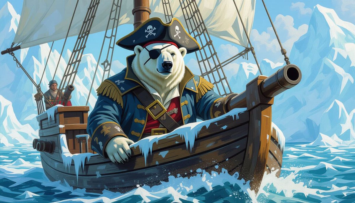 This image shows a polar bear pirate captain with an eye patch and tricorn hat at the helm of an ice ship sailing on an icy sea. The scene is rendered in a comic book style with neo-impressionist and expressionist elements.