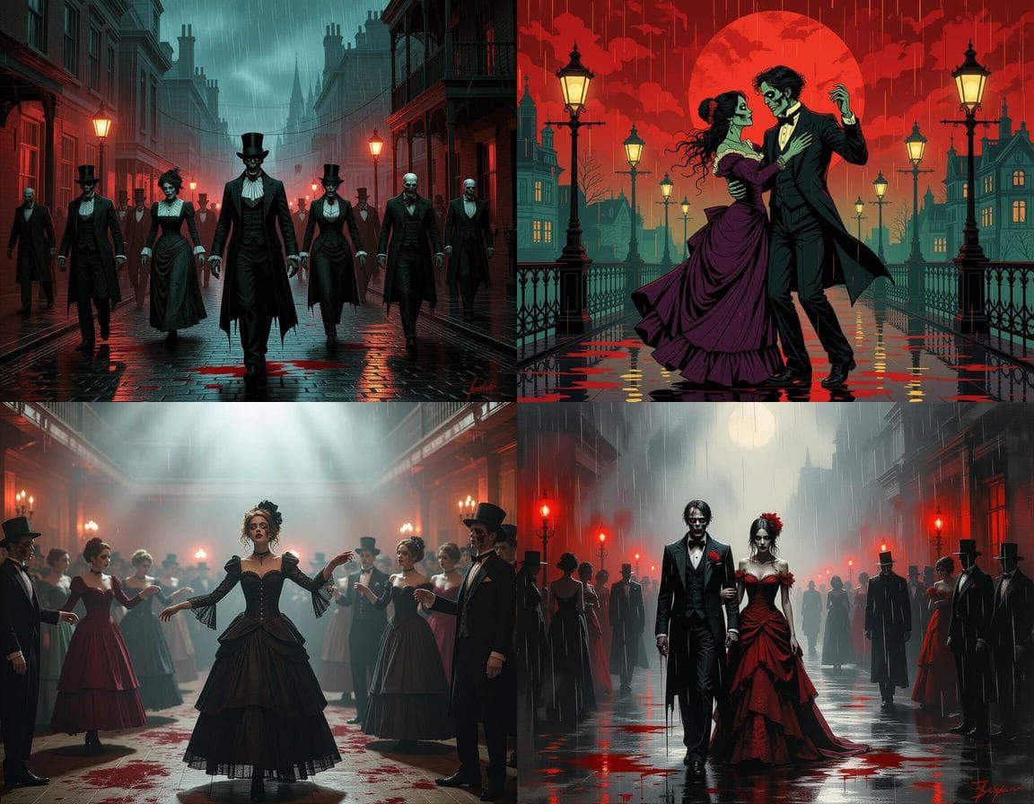 Easily generate your own zombie prom night images with Victorian flair and blood rain effects. Free and simple AI creation.