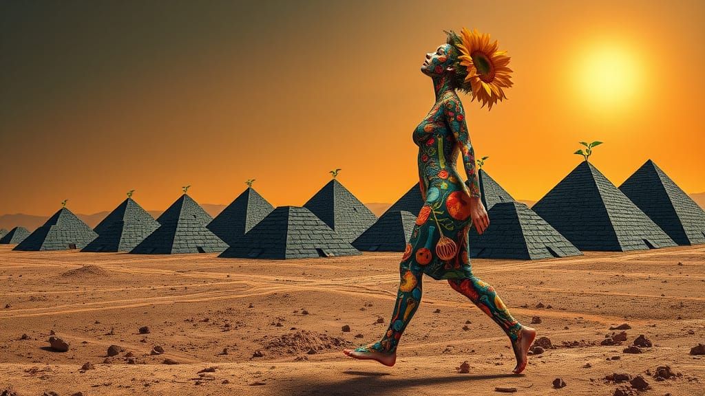 This enchanting image depicts a woman crafted from intricately detailed kitchen tools, blending seamlessly with the natural terrain. Her utensil-like body moves with fluidity, surrounded by serene monochromatic pyramids and thriving plants, evoking an otherworldly atmosphere.