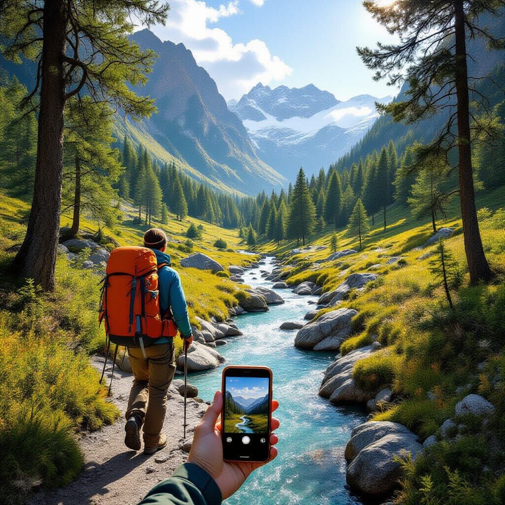 This image shows a hiker on a path beside a stream in a lush diorama. The scene evokes detailed landscapes with colorful and atmospheric lighting, capturing a sense of adventure and natural beauty.