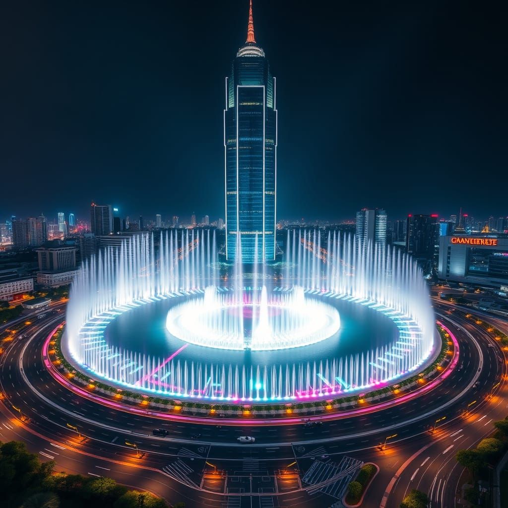 This futuristic fountain plaza showcases a majestic 950-meter circular design with a 615-meter commercial skyscraper at its center, surrounded by vibrant Bangkok cityscapes and dramatic lighting effects.