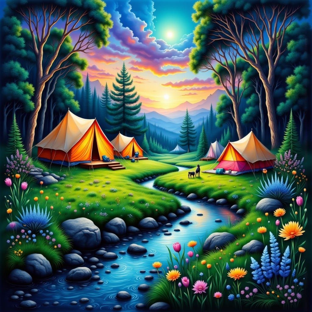 A vibrant oil painting of a campsite nestled in a vivid green landscape, complete with a stream and colorful wildlife. The art evokes a tranquil twilight scene with radiant sunshine.