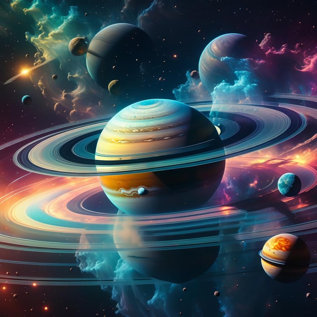A striking picture of a glass Saturn filled with a swirling galaxy. The cosmic surrealism art features glowing planets and nebulae in pastel and vibrant hues, creating a dreamy, psychedelic effect.