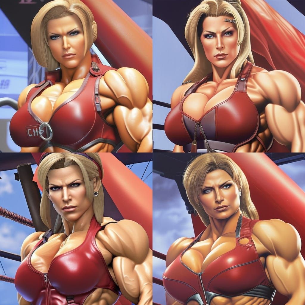 This image depicts a muscular woman cosplaying as Jill Valentine from Resident Evil. The character design and costume evoke the style of classic character illustrations.