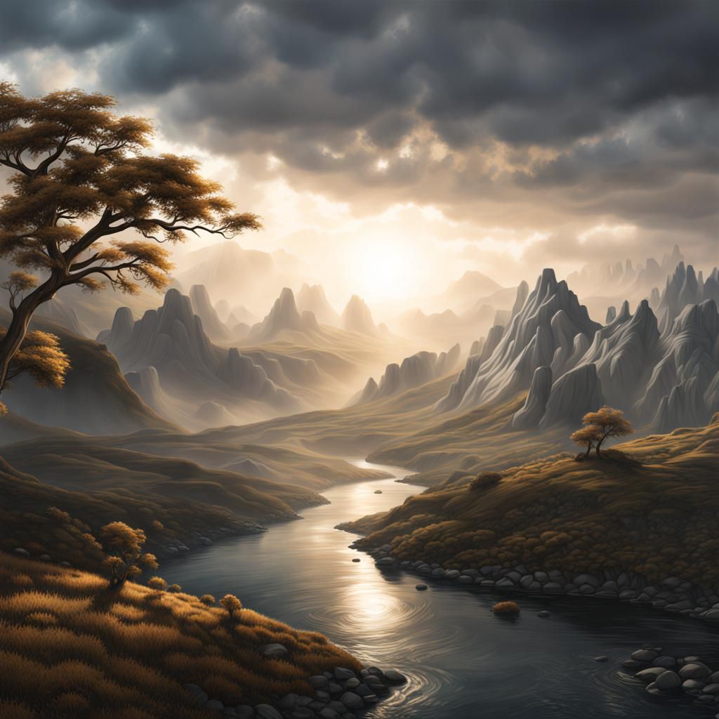 This image showcases a hyperrealistic landscape of a world future. The scene is rendered in high quality with mystical lighting, reminiscent of a professional photograph.