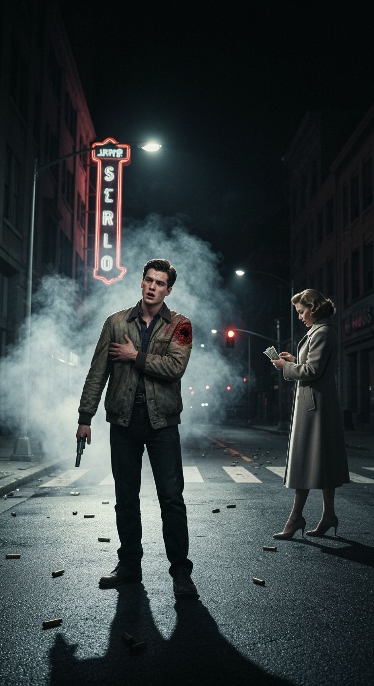 This image depicts a man wounded after a city shootout at night, protected by an unseen force. Nearby, a woman turns away, coldly counting money under neon lights, embodying themes of isolation and lost faith in a cinematic noir style.