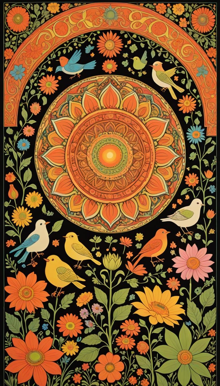 This image captures the essence of 1968 psychedelic concert posters with vibrant colors, flowers, birds, and intricate mandala designs. Rendered in gouache and watercolor with a cheerful, bright aesthetic.