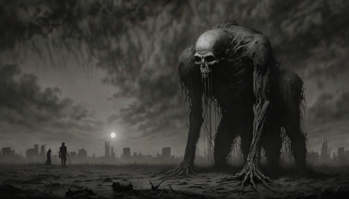 This haunting image features dark, shadowy figures in a deep, rich environment, reminiscent of the works of Zdzisław Beksiński and Giulia Lama, with a focus on brushed charcoal textures and deep saturation.