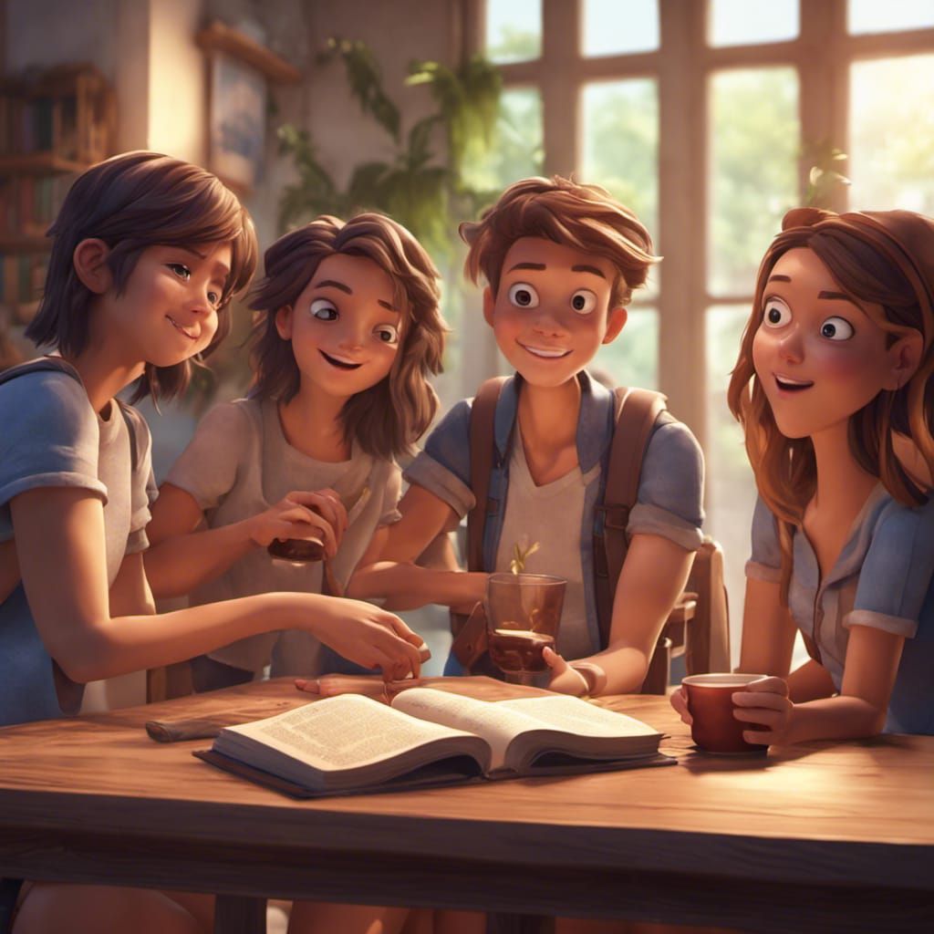 Create your own heartwarming cartoon images of teens reading the bible and drinking boba using our free AI image generator!