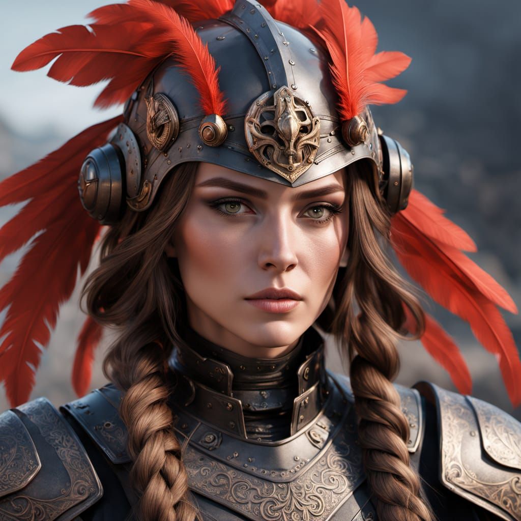 A striking portrait of a woman in ornate metal armor. The close-up shot emphasizes the detailed helmet, soft lighting, and intense gaze, rendered with photorealistic detail.