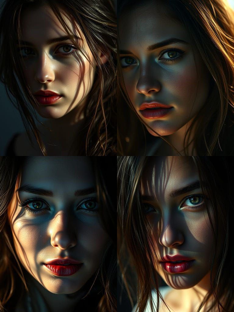 This captivating portrait captures a woman's enigmatic aura in a soft, moonlit ambiance, with delicate nuances of her expression and intricate details of her gaze, amidst a masterful interplay of shadow and light, reminiscent of Renaissance artistry
