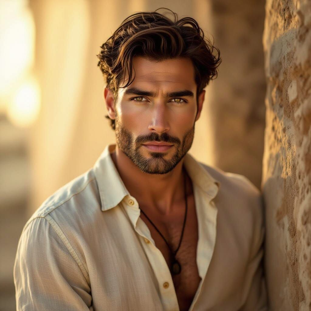 A captivating portrait of a man radiating warmth and emotional depth. The subject features striking eyes, a strong jawline, and dark hair, styled in bohemian attire within a golden-lit, ethereal setting.