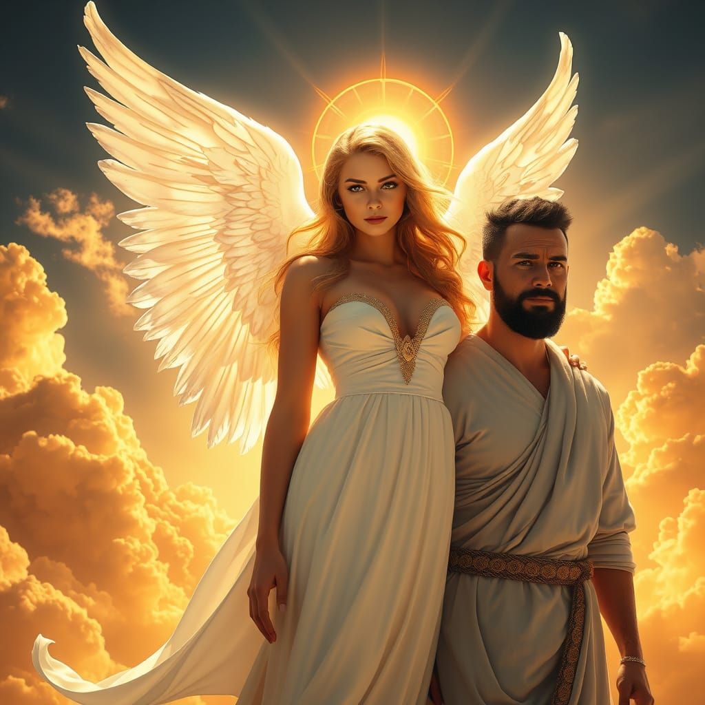 This image shows a celestial woman with white wings and a golden halo, standing next to a man in simple robes. Golden clouds and sun rays surround them, rendered with dramatic shadows and vibrant colors.