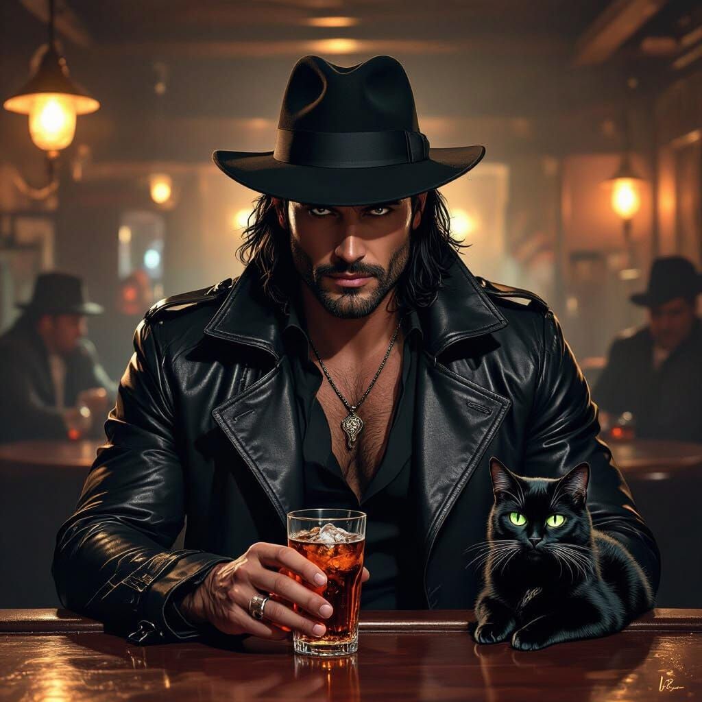 A shadowed man in a trench coat holds a drink in a jazz club. A green-eyed cat sits on the bar, all rendered with dramatic lighting and a nostalgic atmosphere in a classic illustration style.