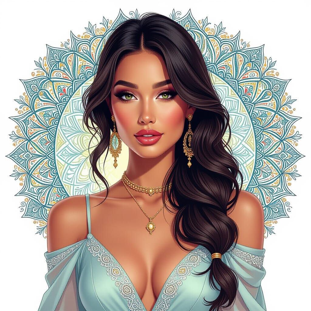 This image shows an elegant woman encompassed by vibrant, fluid Zentangle patterns. The hyperdetailed design evokes digital painting and ink illustration techniques for a modern digital art aesthetic.