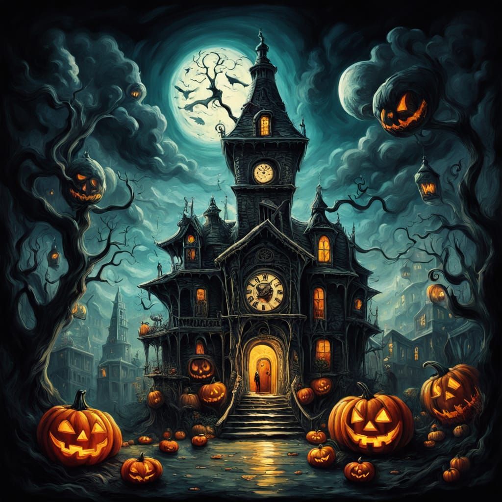 This image depicts a surreal Halloween night with spectral figures, melting clock towers, and distorted haunted houses. Rendered as an oil painting with vibrant, contrasting colors and an ethereal glow.