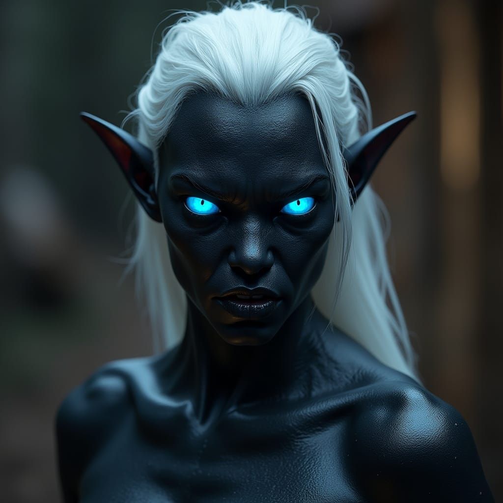 This image shows a fierce, muscular elf with striking blue eyes and white hair. The cinematic portrait features dramatic lighting and rich color depth, reminiscent of dark fantasy concept art.