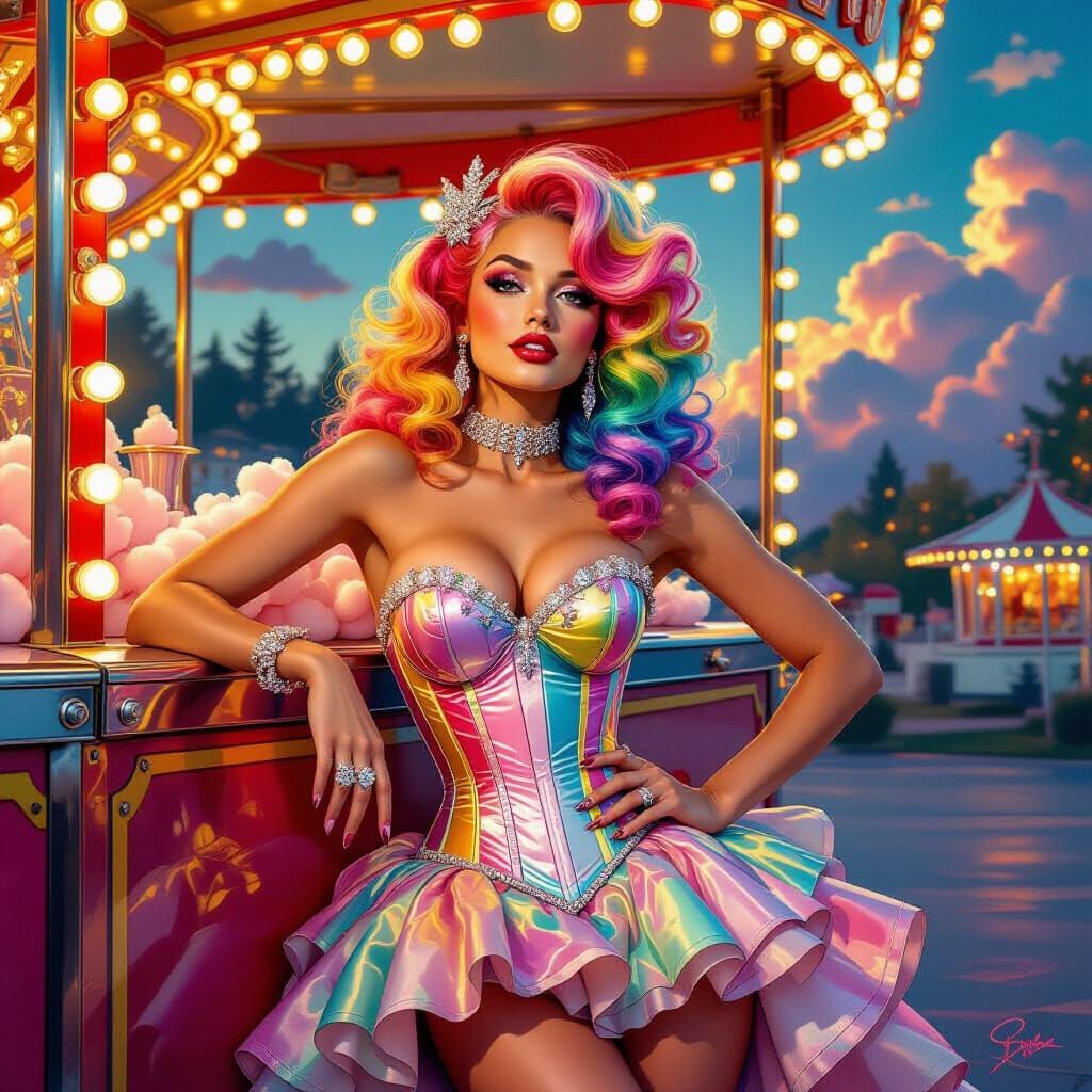 Generate dazzling images of retro carnival scenes and candy-colored characters with our free AI image generator!