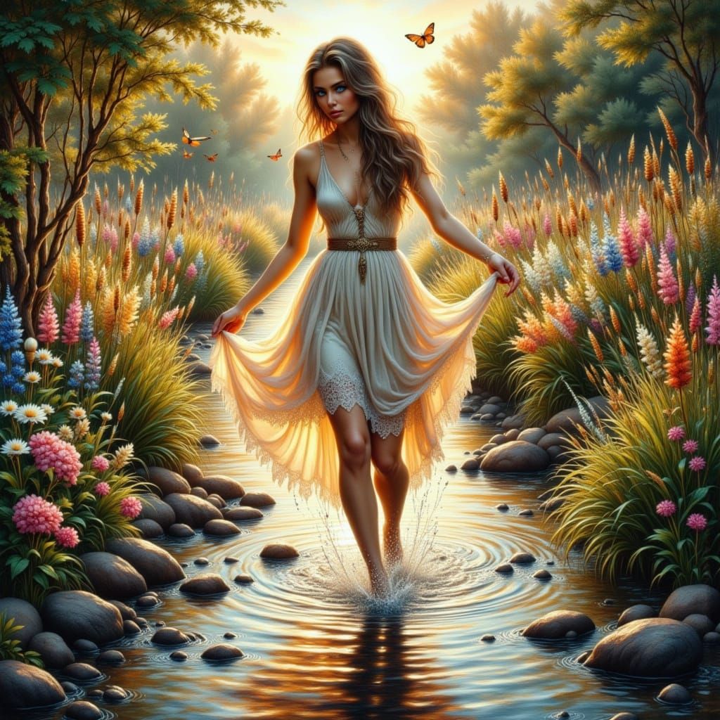 This image shows a beautiful woman wading in a creek. The artwork features layered detail, soft ethereal light, and a lush garden ambience, rendered as an iridescent oil painting.