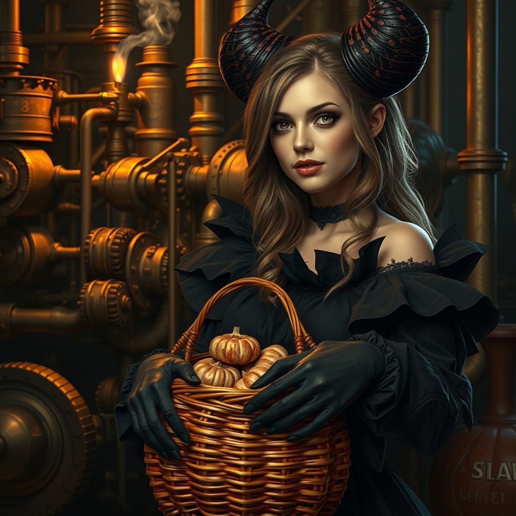A detailed image of a young woman in a demonic Halloween costume holding a pumpkin basket, rendered in the realistic and sensual style of Milo Manara with dramatic lighting.