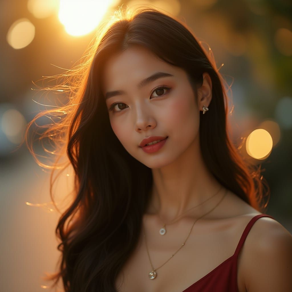 A captivating image of a young Southeast Asian woman with flowing dark hair, bathed in golden sunlight. The portrait showcases a cinematic fine art photography style, emphasizing soft lighting and a blurred background.