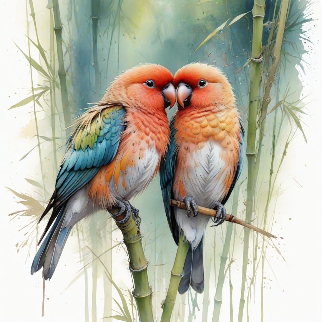 A watercolor image of two lovebirds perched on bamboo. The artwork captures the birds' affectionate interaction with vibrant colors and stylized details.