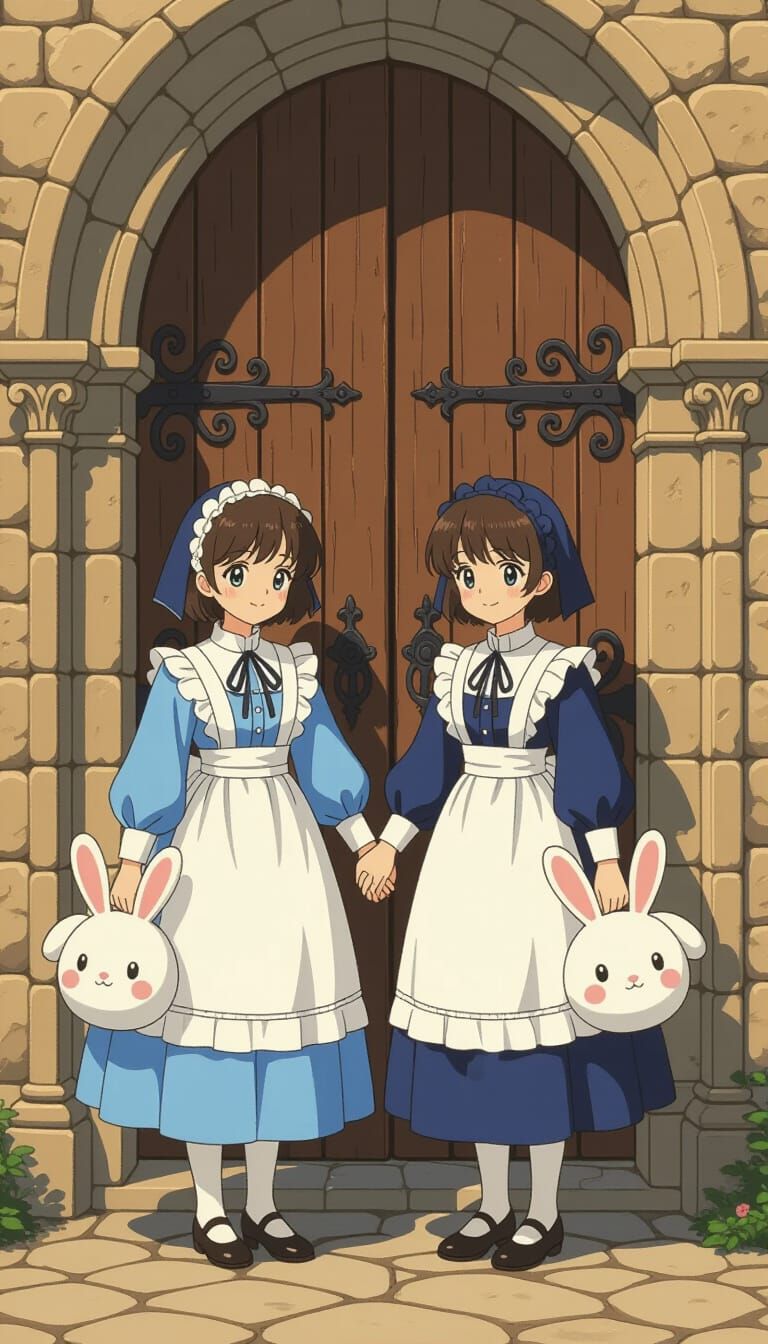 This image shows two young twins in elegant, frilly dresses and headbows, holding stuffed bunny bags. They stand before a detailed medieval wooden door with a gothic stone wall background.